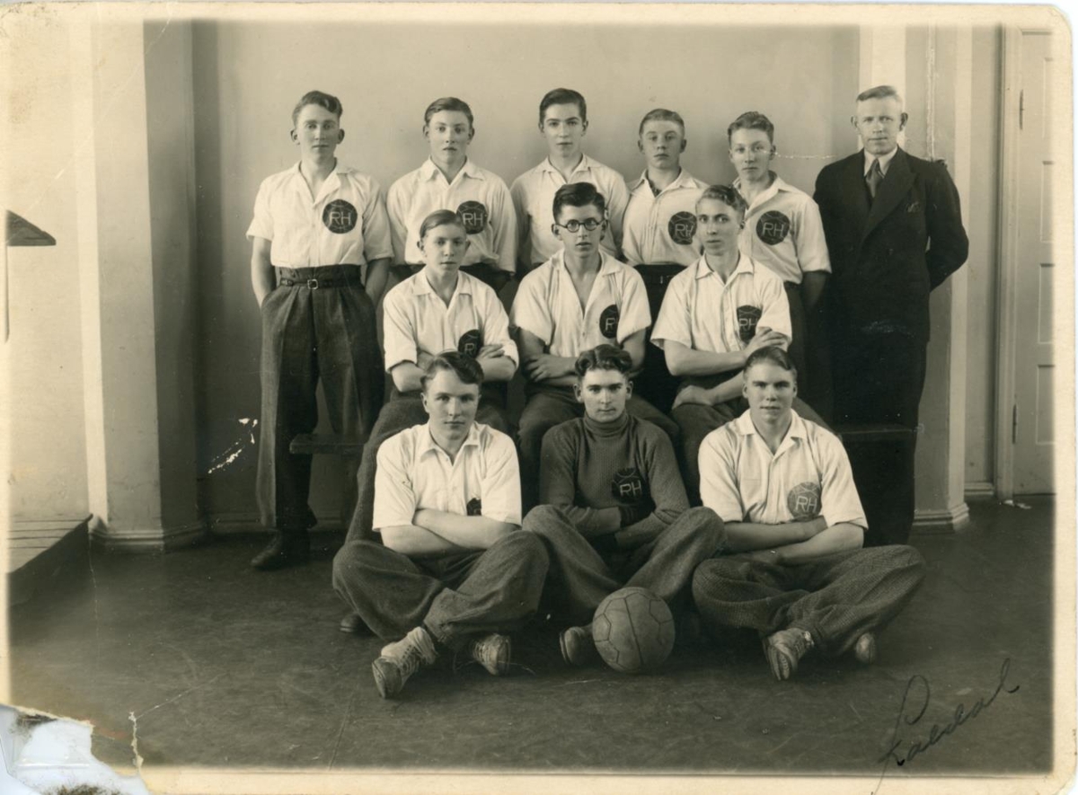 Hópur unglingsdrengja í hvítum pólóskyrtum og dökkum buxum. Fremstu þrír sitja á gólfinu með bolta fyrir framan sig. Í öftustu röð til hægri stendur fullorðinn karlmaður í jakkafötum.