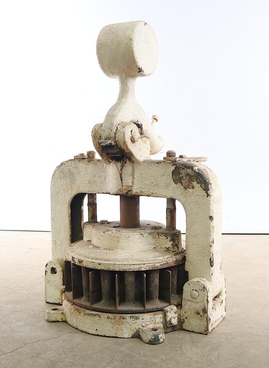 Handvirk deigskurðarvél. Á að standa á borði. Í vélina vantar handfang sem fært er upp og niður þegar fletja út og skera þarf deigið í marga jafnstóra hluta. Hún er hvítmáluð en mjög slitin og ryð farið að sjást. Var í notkun í Brauð- og Kökugerðarhúsi Ágústs Jónssonar og Alfred Nielsen, Njálsgötu 65. Fyrirtækið var stofnað 1931 en lagt niður 1979 þegar Alfreð Nielsen hætti störfum vegna aldurs, þá 73 ára. Gefandi Steinunn Nielsen.