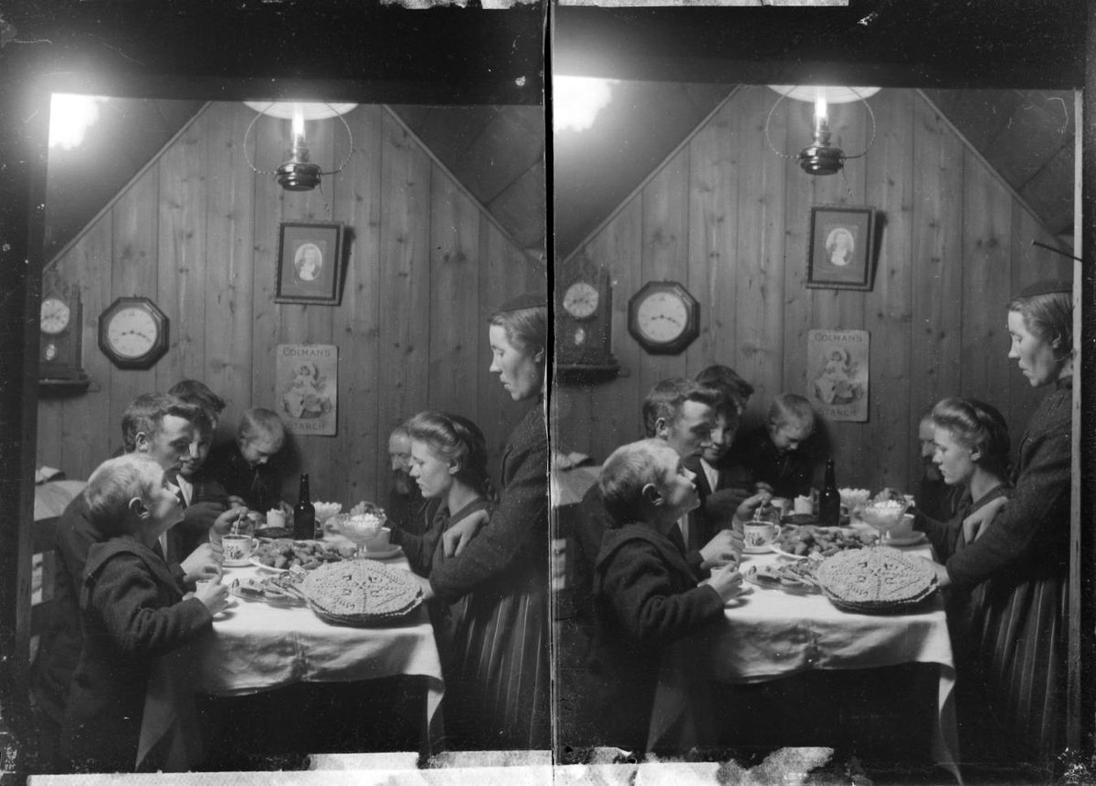 Líklegt er að þetta sé ein af elsta myndum af sveitafólki að snæða við borð, þaðan sem dregið er sögnin að borða, því flestir íbúar torfbæjarmenningarinnar átu mat sinn úr öskum á rúmstokkum sínum. Líklega situr fólkið við borð sem sjalda var notað, nema á jólum. Borðið er dálítið hátt og situr fólkið sennilega á bekkjum, því ekki sést í stólbök.