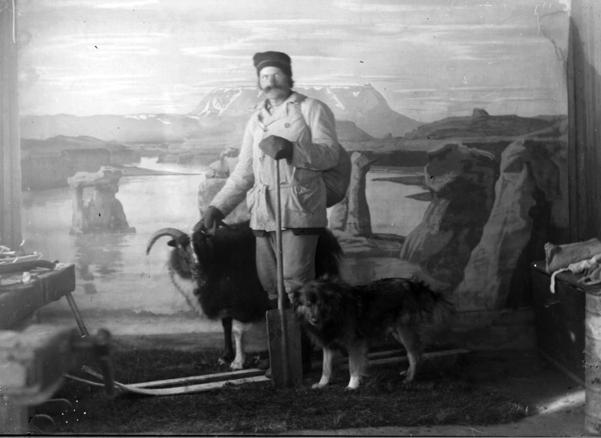 Fjalla-Bensi, Benedikt Sigurjónsson f.9.4.1876 á skíðum með hund og sauð, í myndastofu Bárðar í Höfða. Ekki er víst hvort þetta eru hundurinn Leó og forystusauðurinn Eitill.
