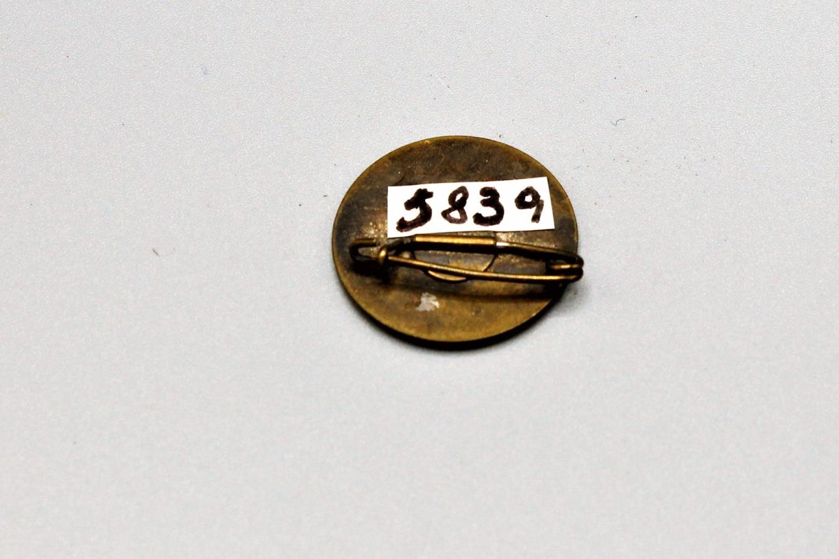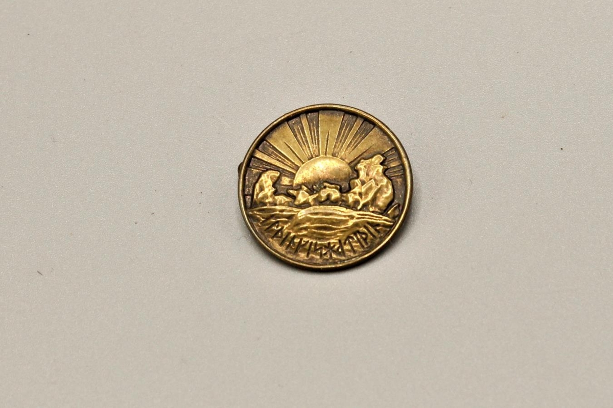 Barmnæla frá Alþingishátíðinni 1930. Sól yfir klettum í Almannagjá. Kopar. Rúnamerking.