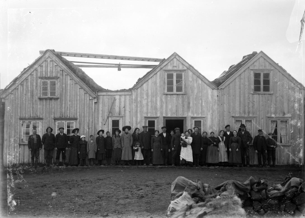 Skútustaðabærinn og fólkið, Skútustaðir í Mývatnssveit. Reisulegur burstabær með tvílyftum burstum. Heimilisfólk og gestir hafa raðað sér á stéttina meðfram húsveggnum til myndatöku, að því tilefni að Árni prestur Jónsson er að flytja austur að Hólmum við Reyðarfjörð, árið 1913.