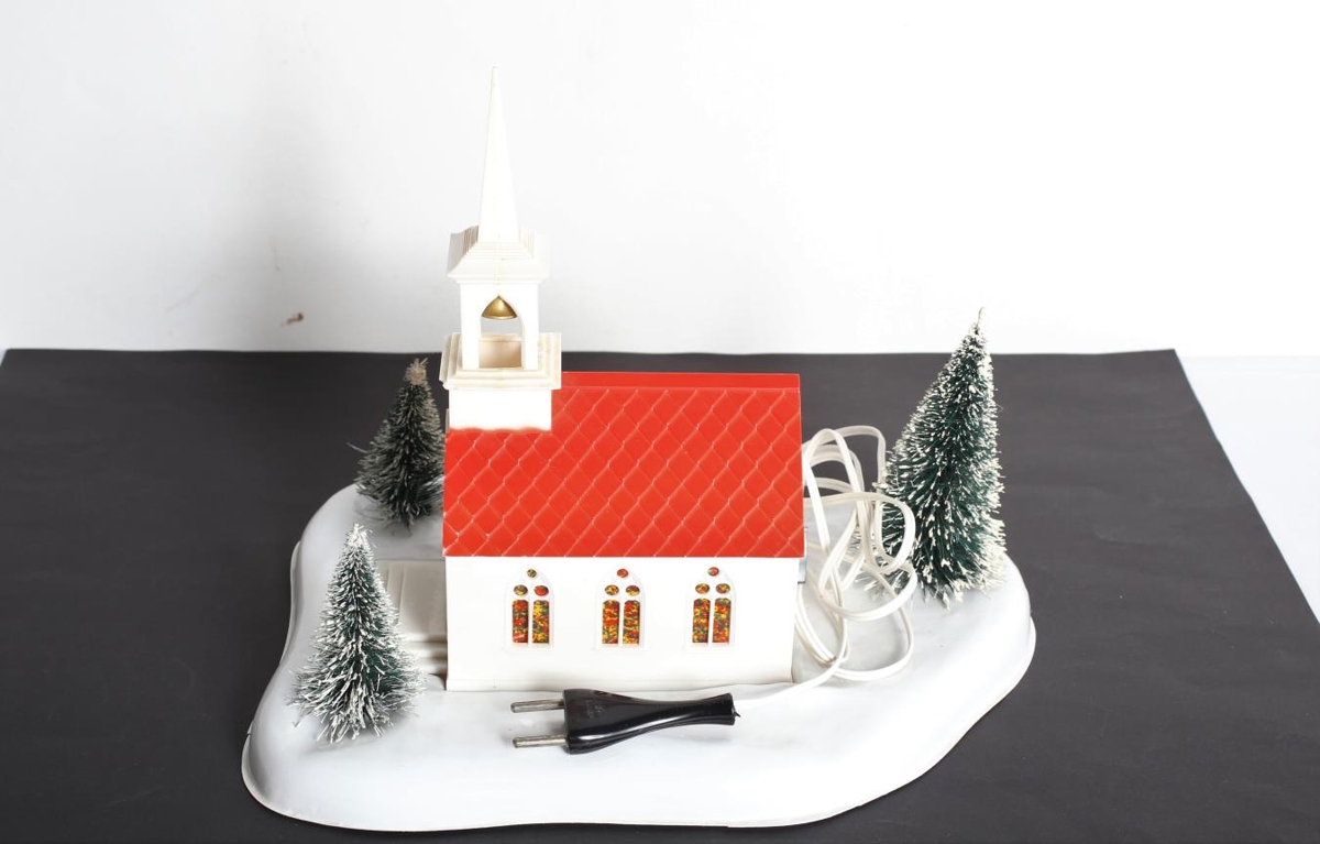 Hvít kirkja með rauðu þaki. Úr plasti. Stendur á hvítum plastbakka. Við kirkjuna eru þrjú grenitré. Hægt er að stinga kirkjunni í samband við rafmagn og aftan á henni er skrúfa til að trekkja hana upp. Virkar ekki.