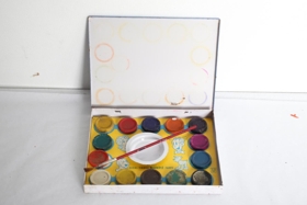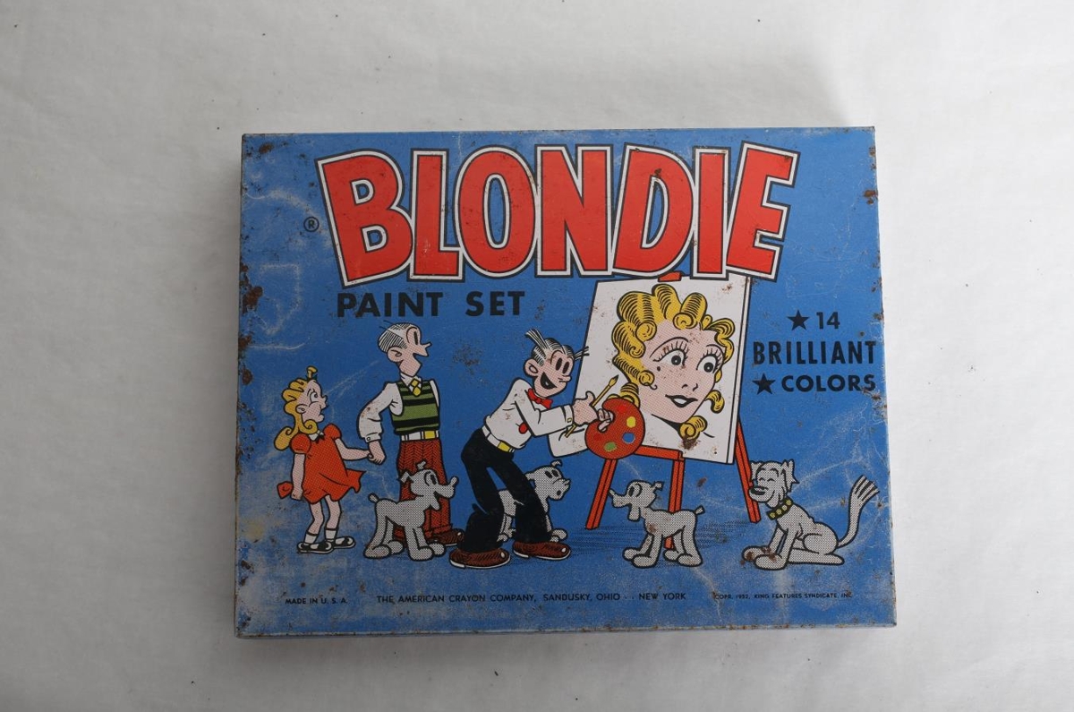 Lítill málmkassi með 14 vatnslitum og einum litlum pensli. Framan á kassanum eru myndir af persónum úr teiknimyndasögunni Blondie eða Ljóska eins og hún hét í íslenskum dagblöðum. Á kassanum stendur "Blondie paint set *14 brillant*colors".