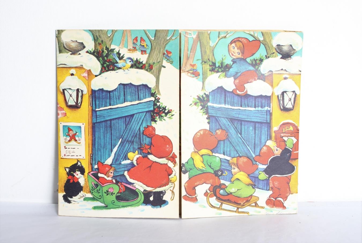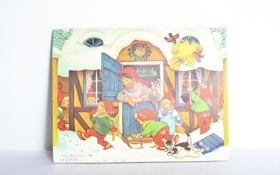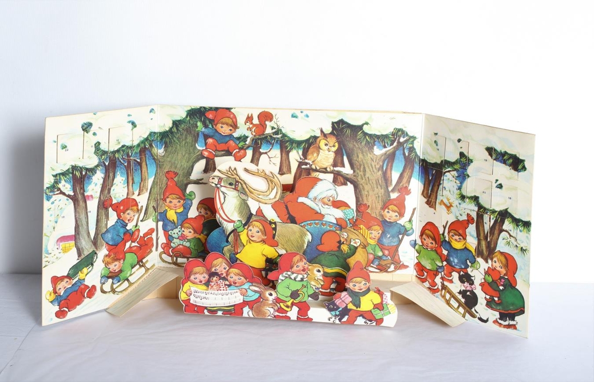 Jóladagatal. Á framhlið er mynd af nokkrum börnum sem kíkja innum hlið. Framhliðin skiptist í tvo hluta sem opnast til sitt hvorrar hliðar. Þegar dagatalið hefur verið opnað sprettur fram þrívíð mynd sem sýnir jólaálfa í skógi. Á myndinni eru 24 merktir gluggar til að opna daglega fram að jólum. Á bakhlið er mynd af húsi, húfsfreyju og nokkrum jólaálfum. Framleiðandi: Carlsen Verlag GMBH, made in Denmark.
