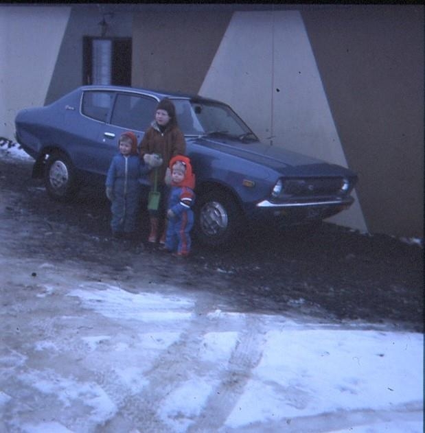 Þrjú börn standa fyrir framan bláa fólksbifreið. Barnið í miðjunni er stærst og heldur í hendurnar á tveimur yngri sitt hvoru megin við sig. Bíllinn stendur upp við húsvegg.