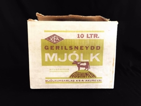 Mjólkurkassi, pappakassi undan 10L af mjólk frá KEA. Kassinn er hvítur með áprentuðu merki og upplýsingum í grænum og brúnrauðum lit. Á kassanum stendur : KEA. Gerilsneydd mjólk. Fitusprengd, homogenized. Mjólkursamlag KEA Akureyri. Auðhumla (Mynd af kú sem stendur á hól undir stendur Auðhumla). Mjólkin var í glærum plastpoka. Á plastpokanum var plastkrani sem var dreginn út um rifuna sem er framan á kassanum.