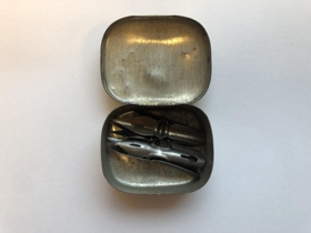Lítið málmbox sem upprunalega hefur geymt nálar fyrir grammófón. Á loki er mynd af hundi hlusta á grammófón, rauður bakgrunnur og texti á boxi "HIS MASTER´S VOICE" / REGISTERED TRADEMARK / LOUD TONE.