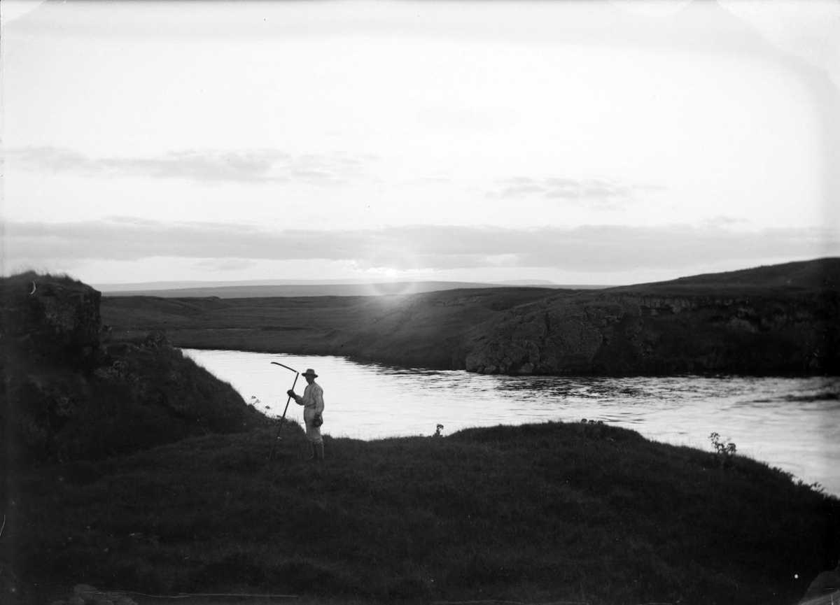 Einn maður stendur við árbakka með orf og ljá í hendi og ber manninn og ljáinn í vatnið. Ljósmyndarar hafa löngum notað fólk sem kennileiti í myndum sínum og stundum aðeins sem stærðartákn til að við sjáum betur hversu stór foss eða flúðir eru. Hér er maðurinn einn í náttúrunni með sólarlagið í bakgrunni. Hugsum okkur myndina án mannsins. Væri það jafn góð mynd og þessi? (ILB)