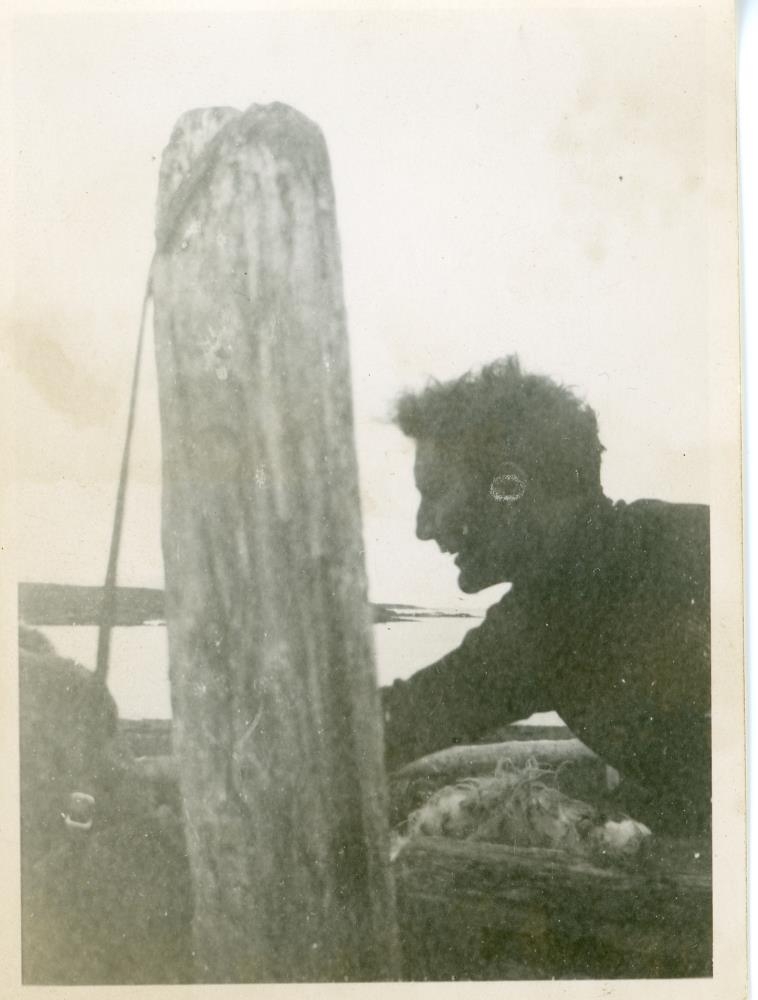 Maður stendur hægra megin við rekaviðardrumb eða -staur. Í baksýn má sjá sjóinn og svo tanga í fjarska.