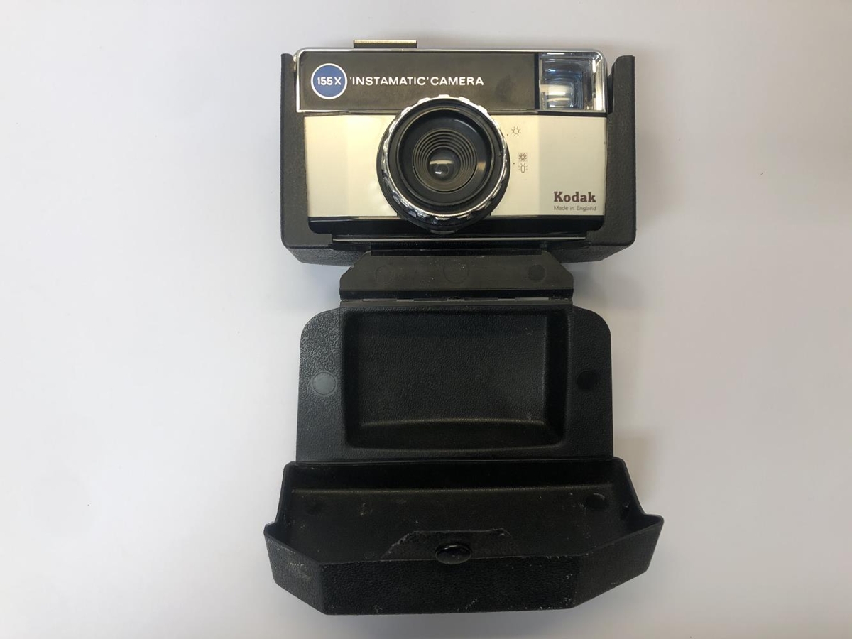 kodak-myndavél í tösku. Vélin smellur ofan í töskuna sem er úr svörtu plasti. Myndavélin er af gerðinni Kodak Instamatic 155x. Úr eigu föður gefanda.
