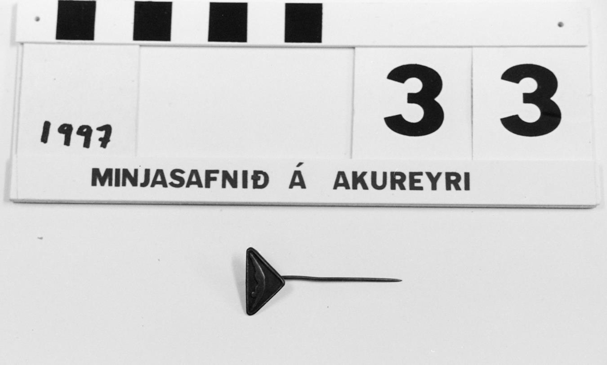 Barmmerki úr málmi með upphleyptri mynd af manni í sundstellingum.