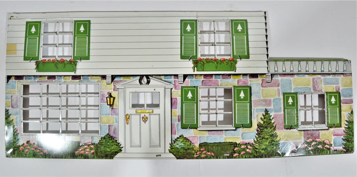 Framhlið af dúkkuhúsi úr blikki. Ekki vitað hvar restin af húsinu er.