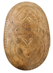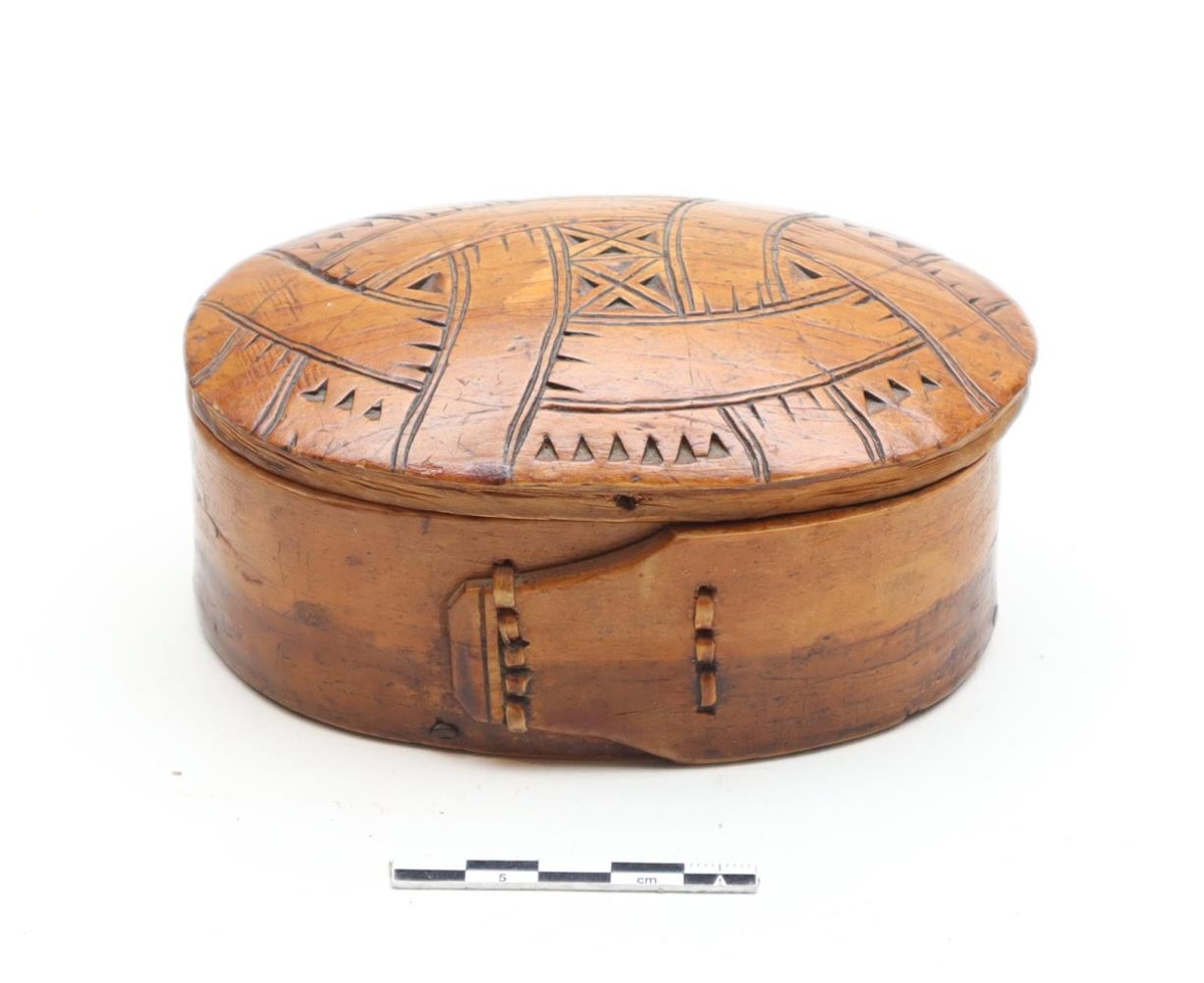 Smjöraskja úr tré með útskornu loki. Lokið er gamalt og útskorið með stórum tígli og tveimur hringjum. Það er neglt með trénöglum og saumað að aftan. Ílátið sjálft er nýrra. Það er úr einhverskonar krossviði og saumað með koparvír. Botninn er úr venjulegum viði, sennilega furu og festur með trénöglum.