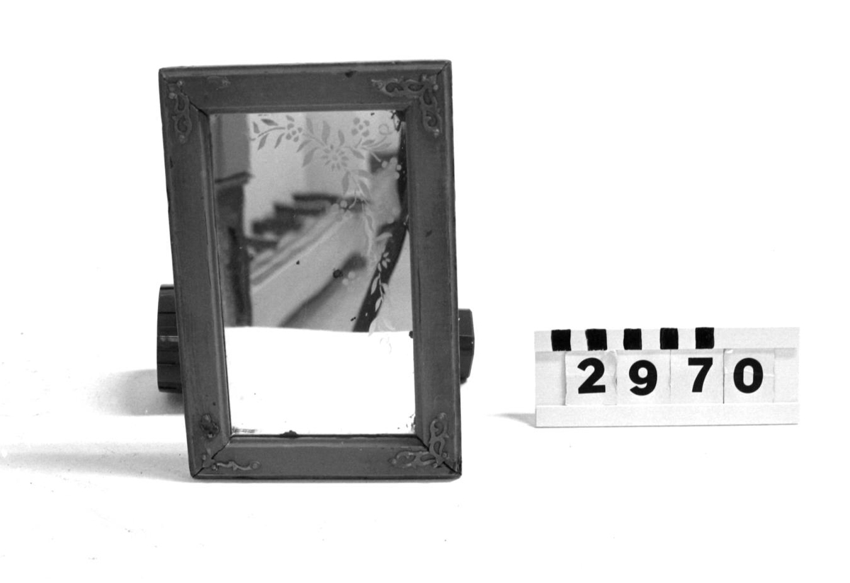 ramma með málmskrauti á hornum, glerið með rósaskrauti.