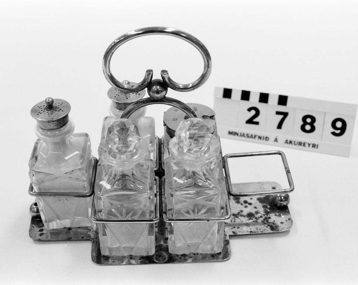 málmgrind, eitt glas vantar. Í tveimur glösunum eru glertappar en á þremur