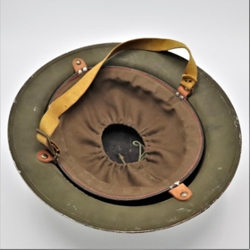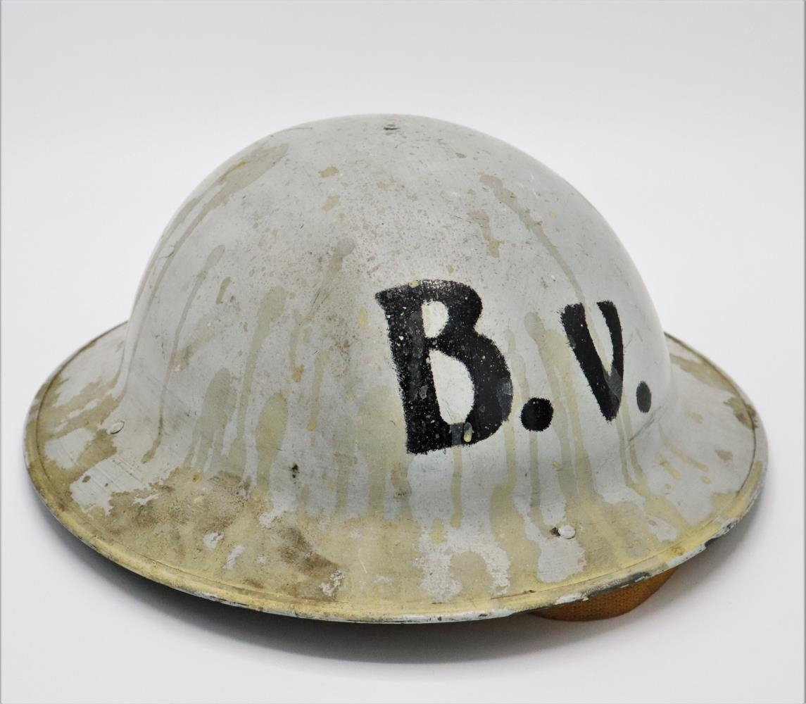 Grár hjálmur með börðum, fóðraður með ól undir hökuna. Áletrun á hjálmi "BV" (byrgisvörður).