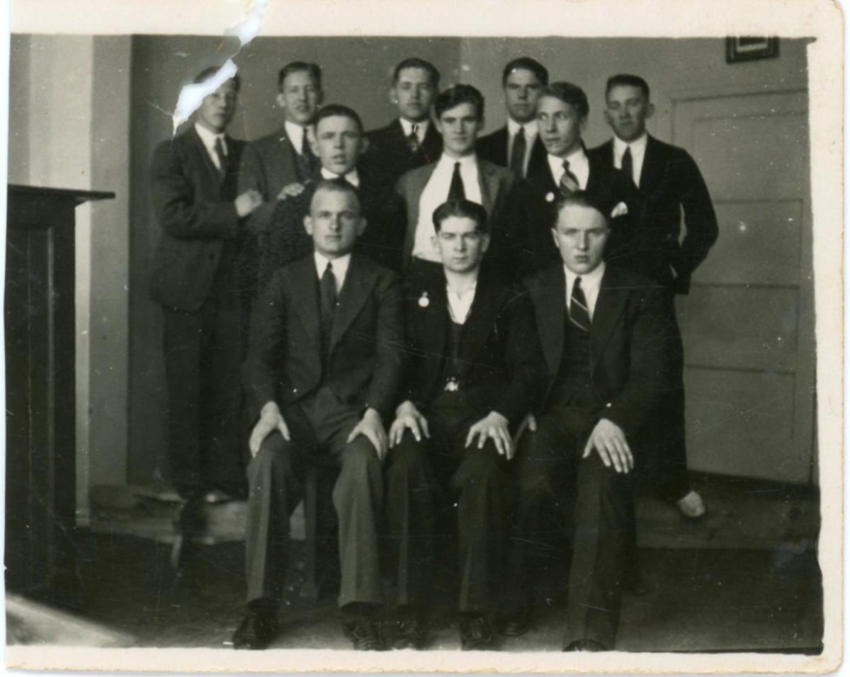 Hópur ungra manna situr fyrir á mynd, allir jakkafataklæddir og flestir með bindi.