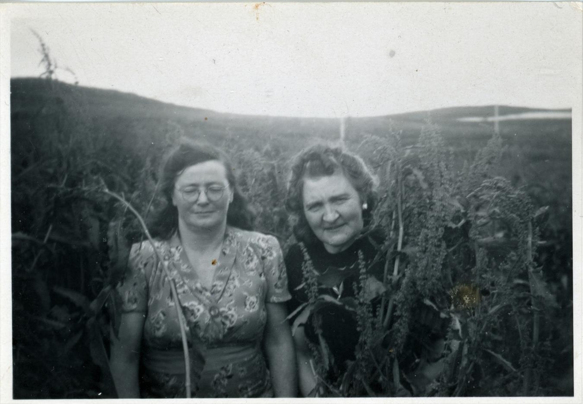 Tvær konur myndaðar umlyktar gróðri, mögulega njóla. Til vinstri er Elín S. Lárusdóttir, dökkhærð, með gleruaug og í mynstruðum kjóli. Til hægri er einnig kona en þar vantar nafn.