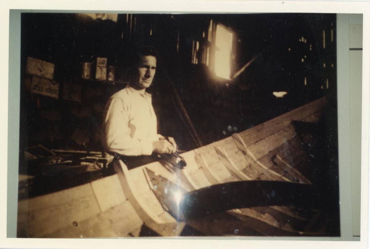 Maður stendur við bát sem er annaðhvort verið að smíða eða laga, haldandi á einhverju.