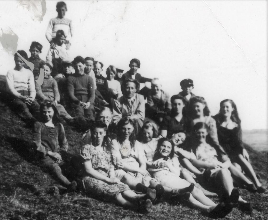Stór hópur af krökkum og unglingum situr í brekku, strákar og stelpur. Í miðju hópsins situr fullorðinn maður, Guðjón Ingimundarson frá Svanshóli.