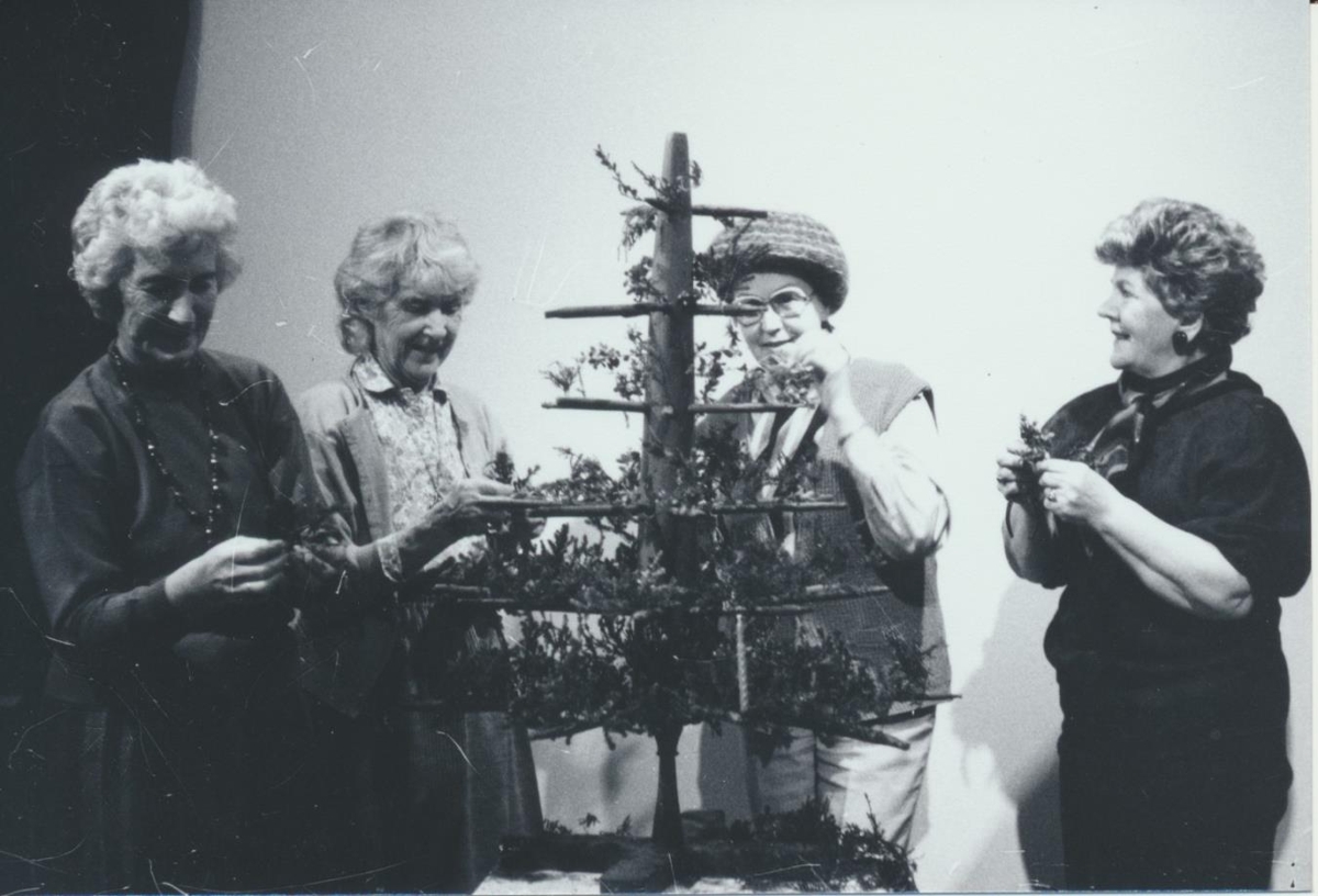 Mynd úr safni Byggðasafns Árnesinga. Gamla jólatréð frá Oddgeirshólum og Hruna skreytt fyrir jólin 1986 á safninu. Ólöf E. Árnadóttir, Ólöf D. Árnadóttir, Sigríður Arnbjarnardóttir og Sigríður ?