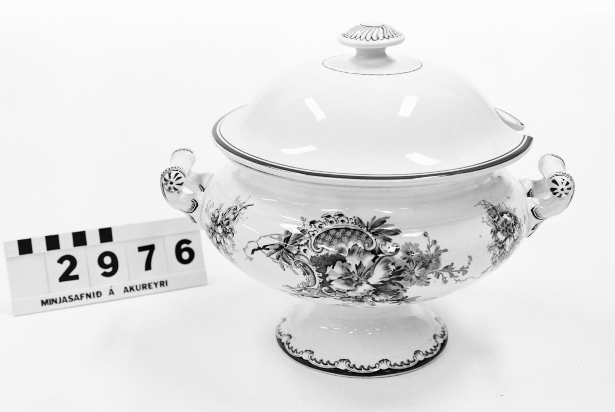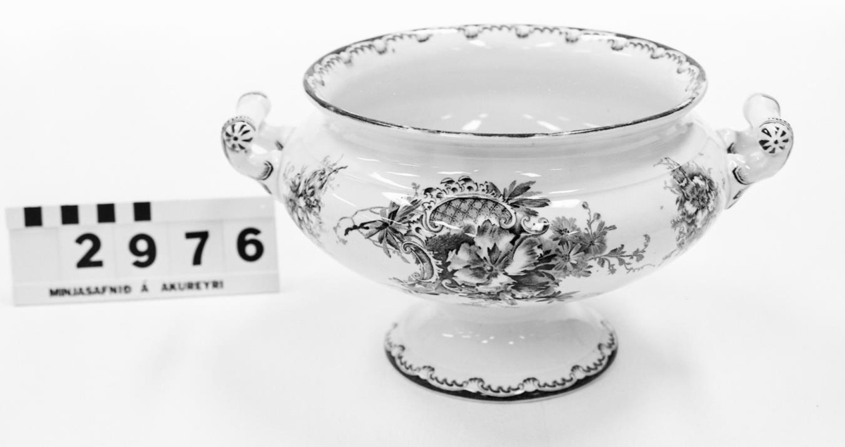 með grænum blómum, með tveimur höldum og á fæti, lok vantar en henni
