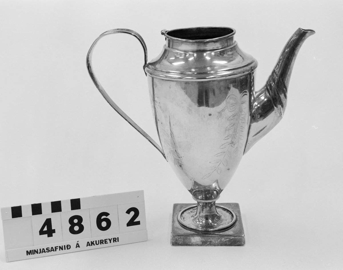 stendur á ferköntuðum fæti. Krotað laufamustur prýðir könnuna á báðum