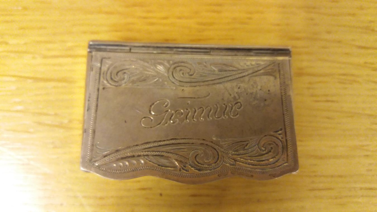 Tóbaksdósir Gríms læknis. Silfurdósir, grafnar á loki, skrautverk og nafnið Grímur. 5 x 3,5 cm að stærð. Fínn gripur. Stimpill er innan í loki. Kom 8. ágúst 2002. Gefandi Hrönn Jónsdóttir, ekkja Gríms Magnússonar læknis frá Álfhólahjáleigu í Landeyjum, f.1907.