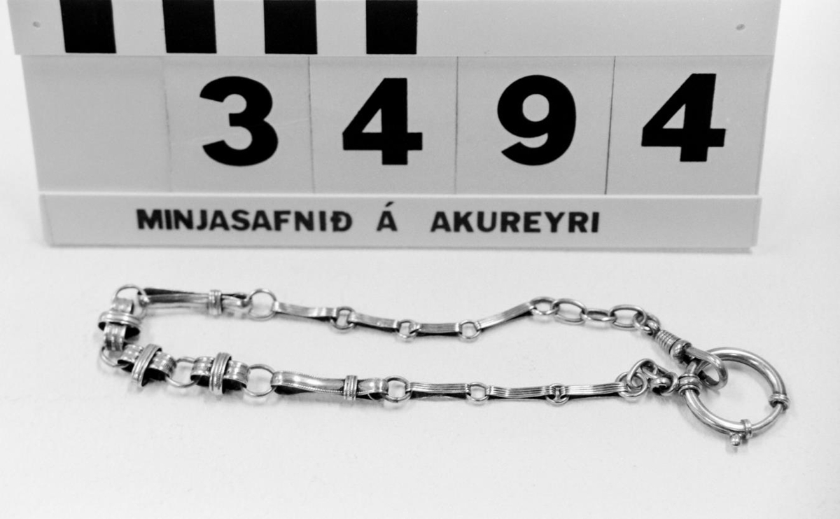 sennilega úr silfri og gerð úr misstórum hringum og mislöngum spennum