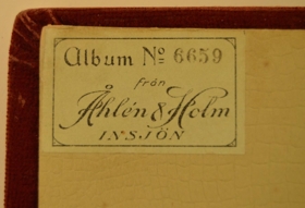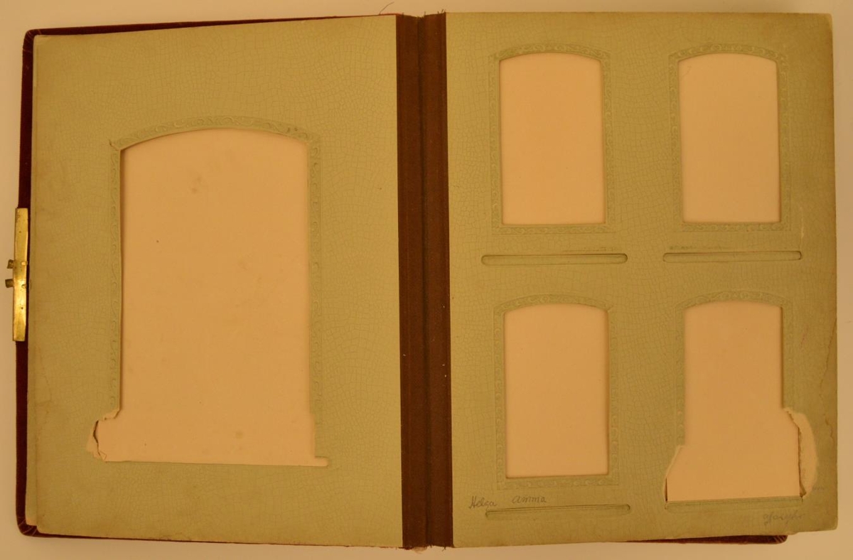 Myndaalbúm úr rauðu flaueli og með gullituðu skrauti á kápu. Úr eigu Guðmunds Ólafssonbar, bónda á Sörlastöðum í Fnjóskadal.