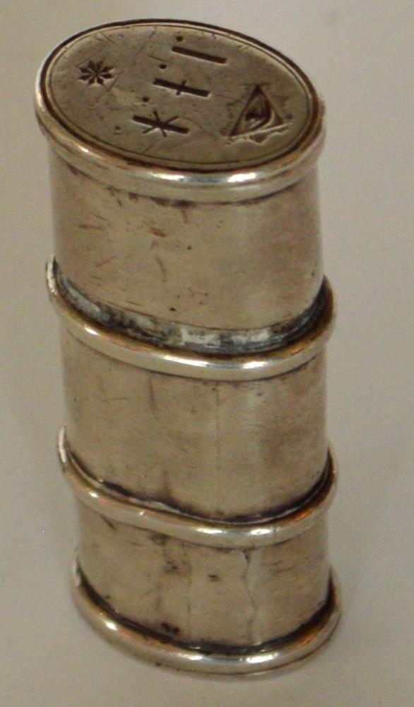 Silfurhylki sporöskjulaga, lengd 5,6 cm. Þetta er signet og pennahylki Hermanns Johnson, sýslumanns á Velli, langafa gefanda. Á annan enda þess er letrað H.E.J. á hinn sama fangamark með rúnaletri. Þar er einnig auga í þríhyrningi og stjarna. Áletrunin mun verk Árna leturgrafara í Reykjavík.