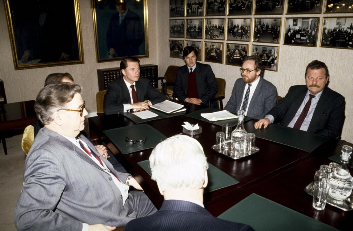 Hópur karlmanna við fundarborð, Steingerímur Hermannsson fyrir borðsendanum. Ljósm: ?