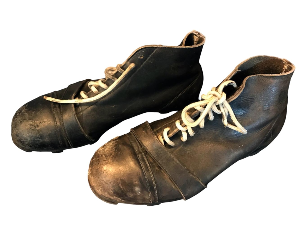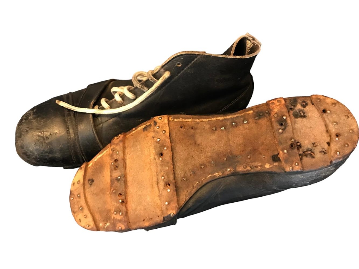 Fótbolaskór úr eigu Ragnar Leóssonar (1920-2014) og eignaðist hann þá árið 1938 þegar hann spilaði með 2. flokki Kára í knattspyrnu á Akranesi. Þegar hann hætti í knattspyrnu, þá notaði hann þá sem skíðaskó. Takkarnir voru fjarðlægðir þegar farið var að nota skóna sem skíðaskó.