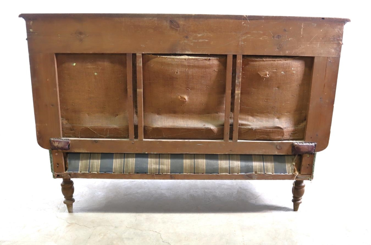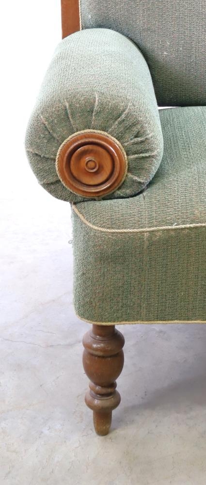 Eikarrammi. Bak, setan og armar bólstrað. Grænt áklæði. Fætur renndir. Hæð 119 sm, lengd 174 sm. Armar á hjörum; hægt er að lengja sófann með því að leggja niður / velta út örmum beggja vegna.