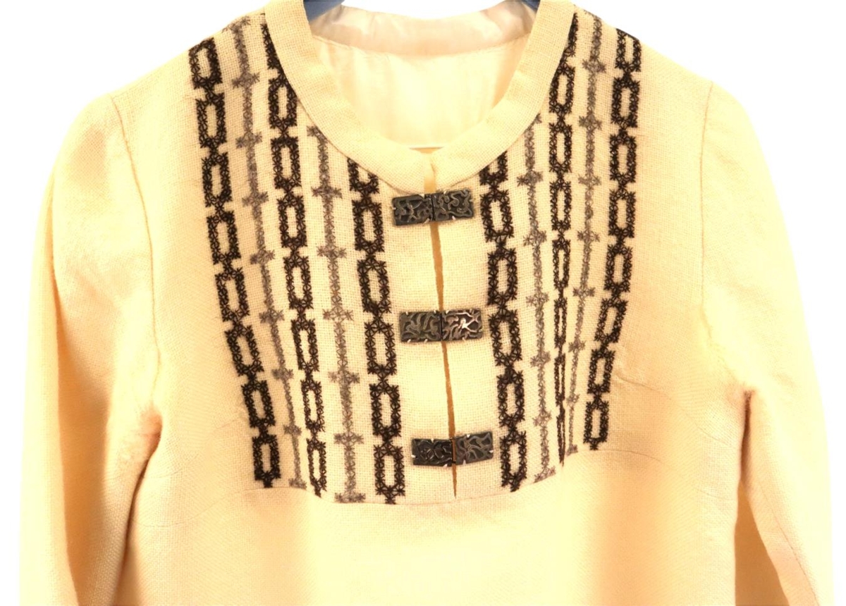 Kjóll úr handofnum ullarjava frá Karólínu Guðmunsdóttur vefara. Hannaður, unninn og notaður af Jóhönnu Þórunni Ingimarsdóttur, þegar hún stundaði nám í Kennaraháskóla Íslands 1964-1968. Sennilega saumaður 1967.