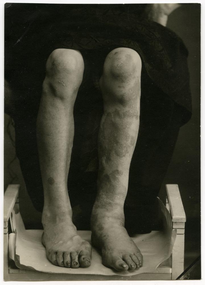 Myndefni: Holdsveikisjúklingar og holdsveiki. Fótleggir sitjandi konu.