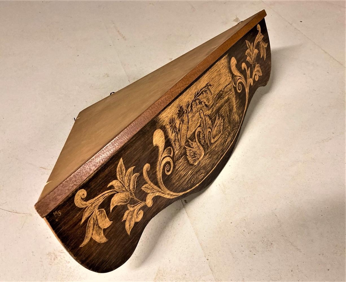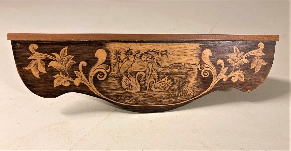 Hornhilla. Afhent af Þórunni Sigurlásdóttur, dánargjöf móður hennar, Magdalenu Sigurþórsdóttur handavinnukennara. skreytt af Magdalenu. Myndefni er þrjár álftir á sundi og blóm.
