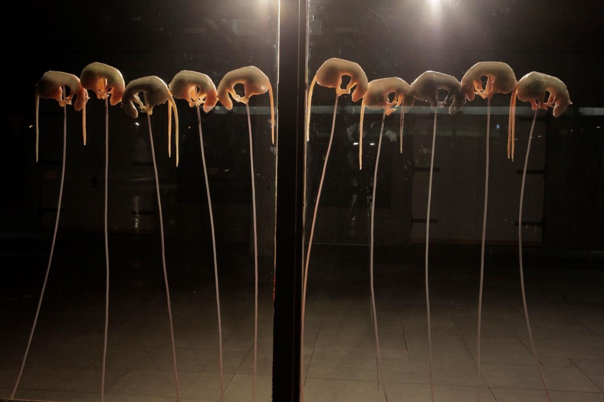 What does happiness sound like? The answer might lie in the work Ratchoir, an installation based on the soundworld and intimate life of rats. The work consists of 14 drawings, a 15 minute audiowork and 9 silicon casts of rats. The work belongs to a series, inspired by an idea for a performance piece, in which Gunnhildur works on the transformation of sound and image. In this work, she transforms rat sounds recorded in a laboratory that researches how rats express happiness. The sound is converted into sonar images because the human ear does not distinguish the language of rats. Gunnhildur interprets the sonar images for human voices with drawings that the women´s choir Hrynjandi performs. In this manner, the sound of rats becomes a sonar image, and then a series of drawings, and a sculpture subsequently interpreted by human voices into a choir piece. This work forms part of a greater whole which Gunnhildur calls Borderline Human where she explores the border between what is human and what we call animal behaviour.