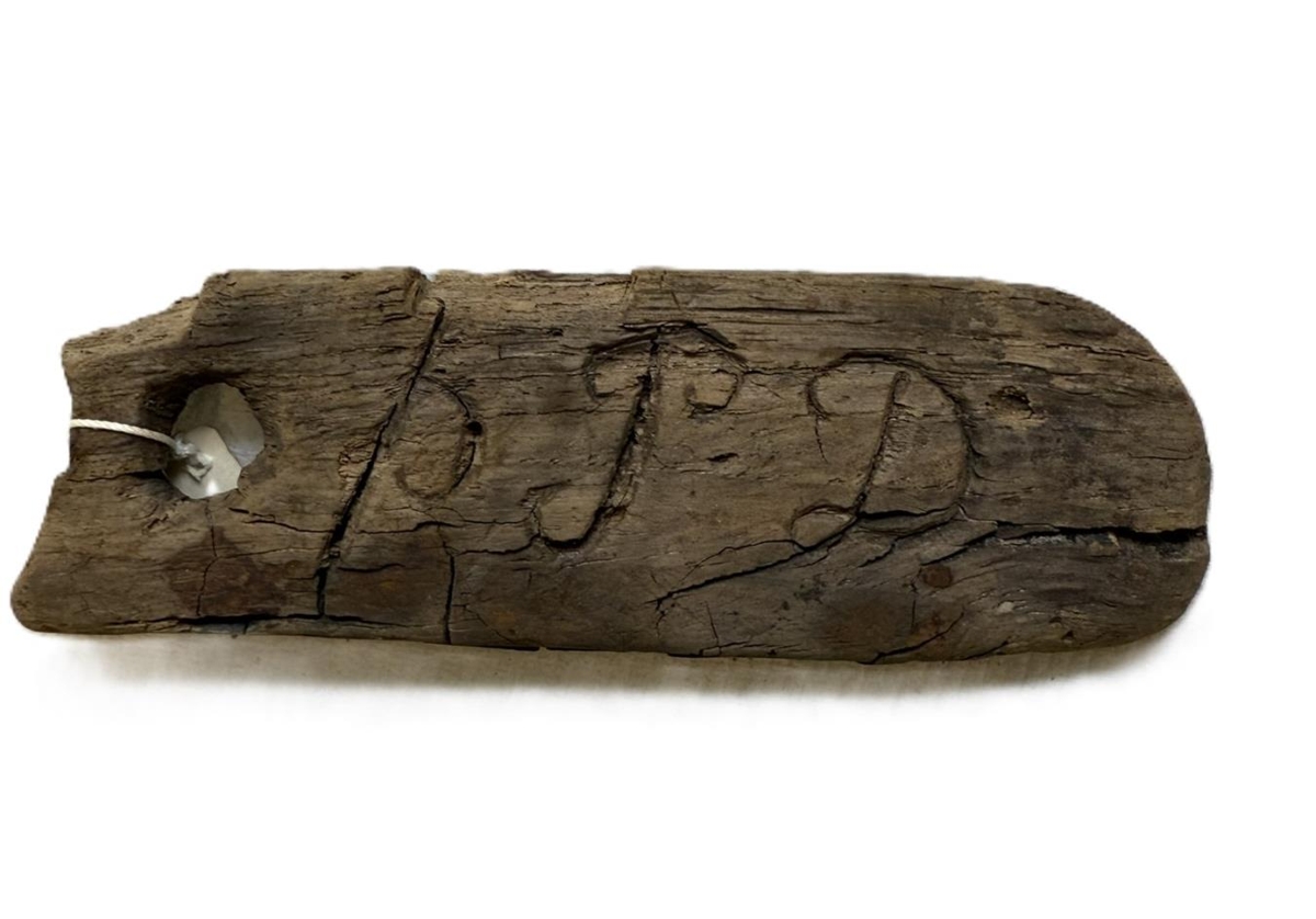 Merkispjald úr tré, Lengd 8,5 cm., breidd 2,9 cm., með fangamarki Þórunnar Pálsdóttur í Gerðum.