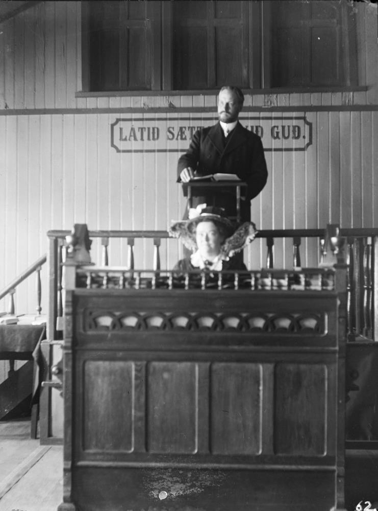Arthur Gook f.11.6.1883 í ræðustól á samkomusal hjá Sjónarhæðarsöfnuðinum, við orgelið er kona hans Florence Ethel Gook f.1.12.1883.