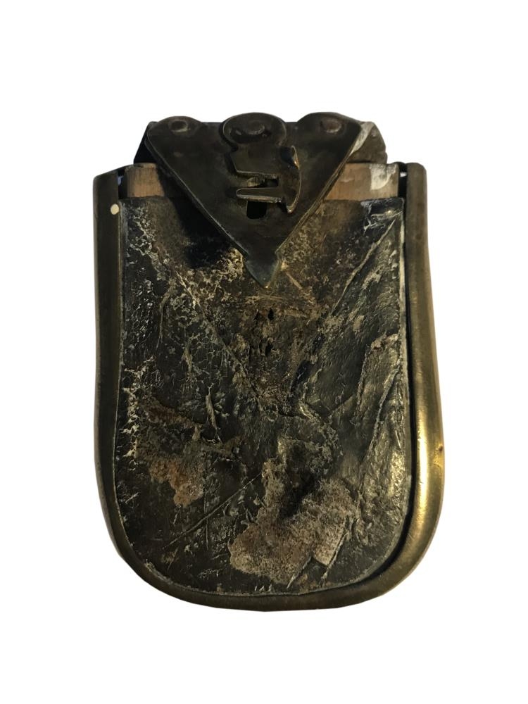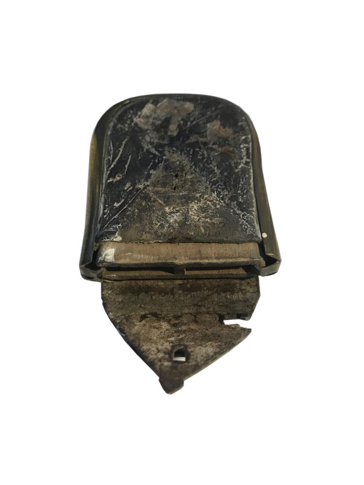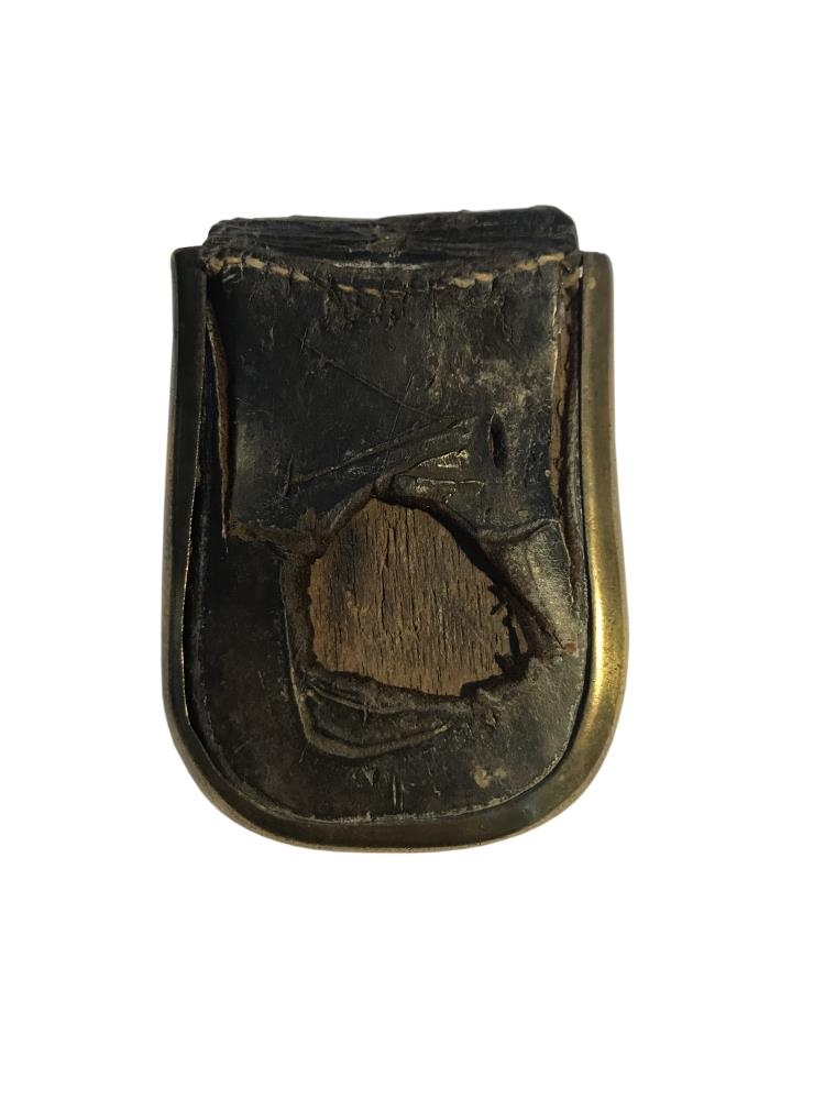 Nálhús (5,5cm x 7,3cm) úr tré, fóðrað með skinni, látúnsvarið á kötnum og með látúnslæsingu. Lykkjuna vantar. Tvö hólf.