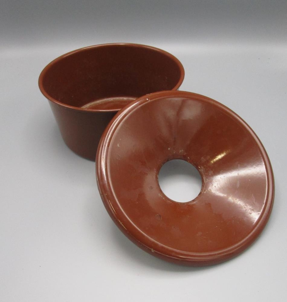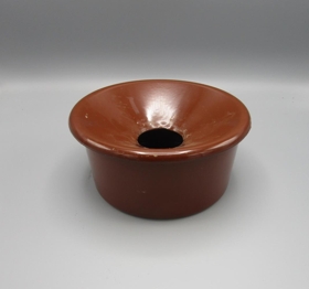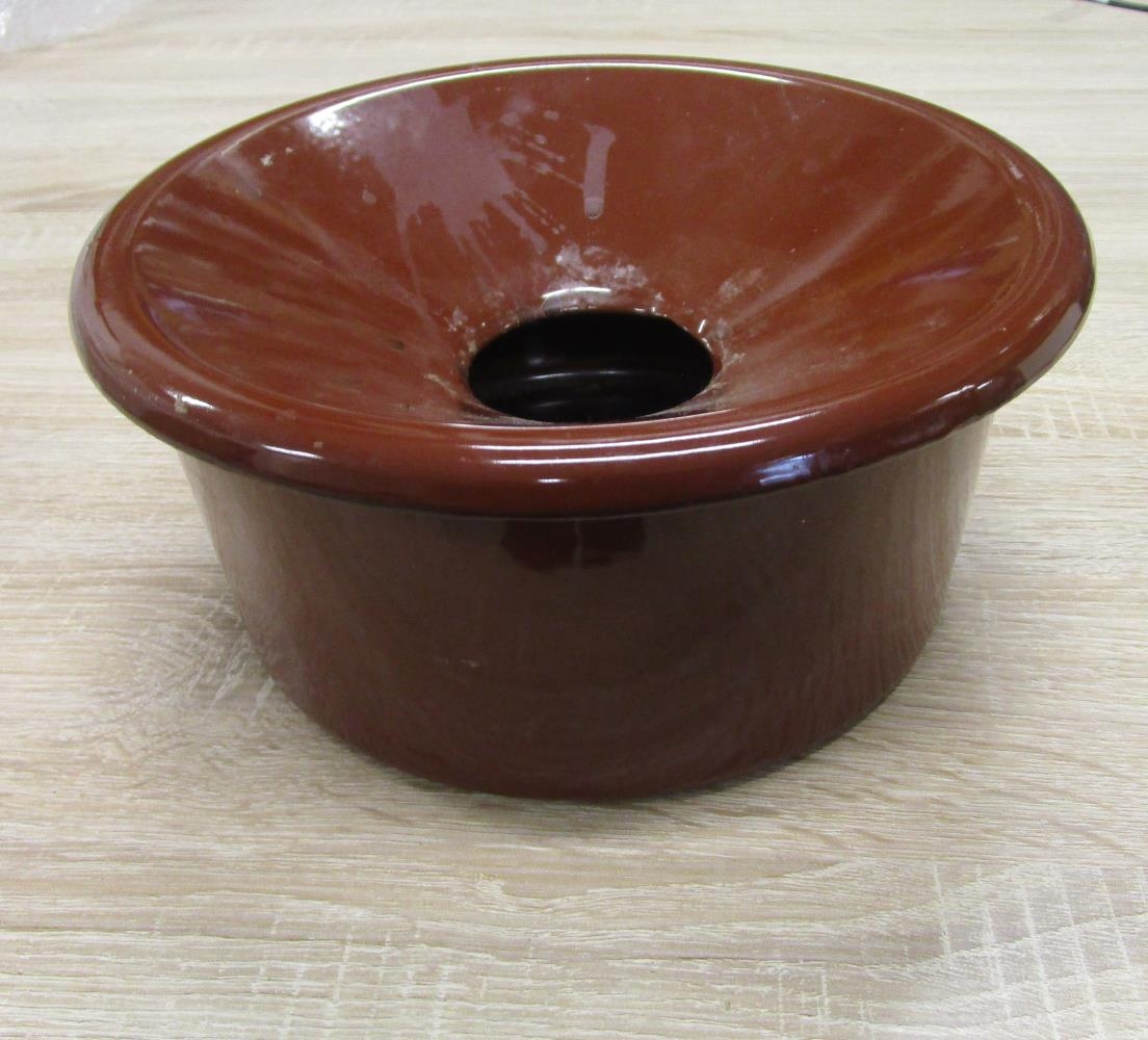 Spýtubakki emaleraður brúnn, þvermál 23 cm. Miðja loksins gengur niður og er með gati.
