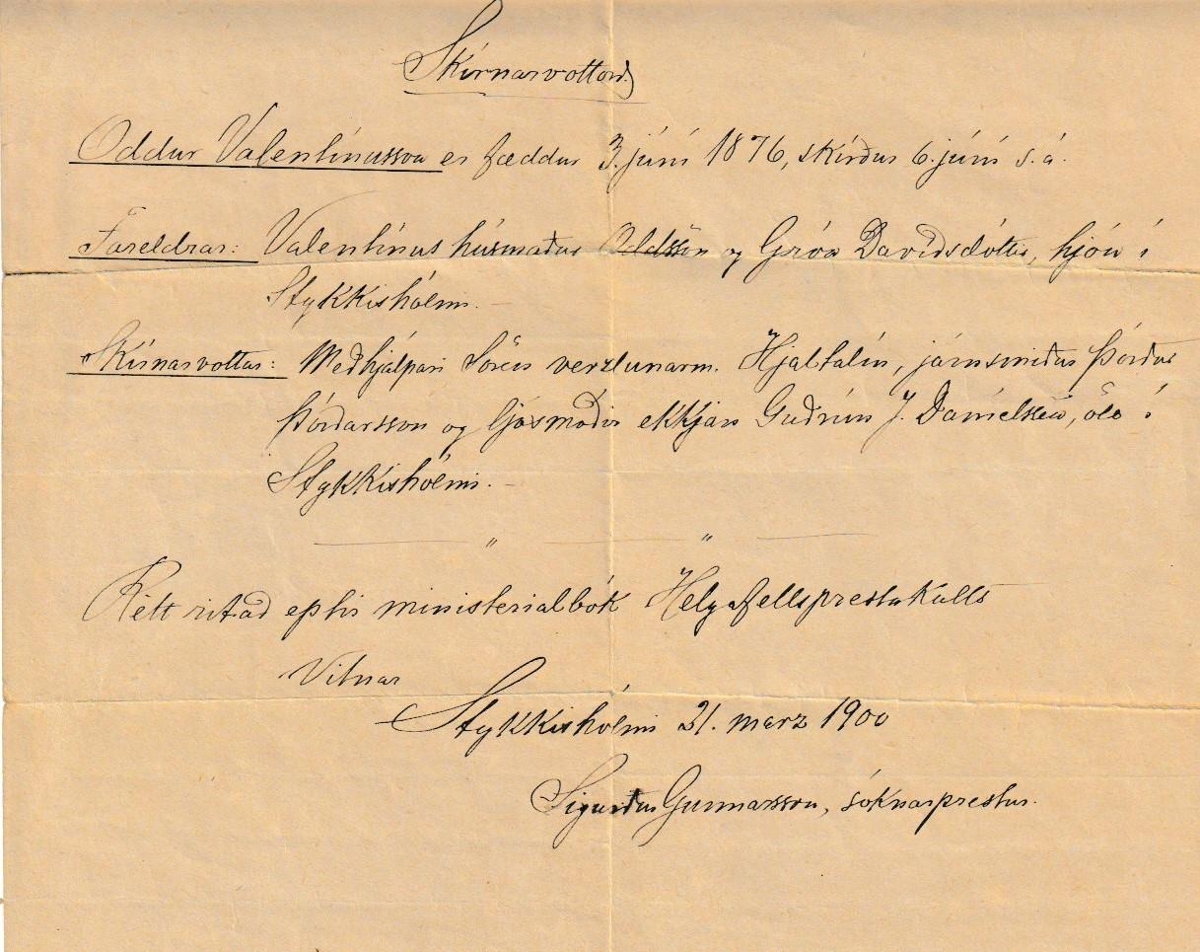 Odddur Valentínusson er fæddur 3. júní 1876, skírður 6. júní s. á.
