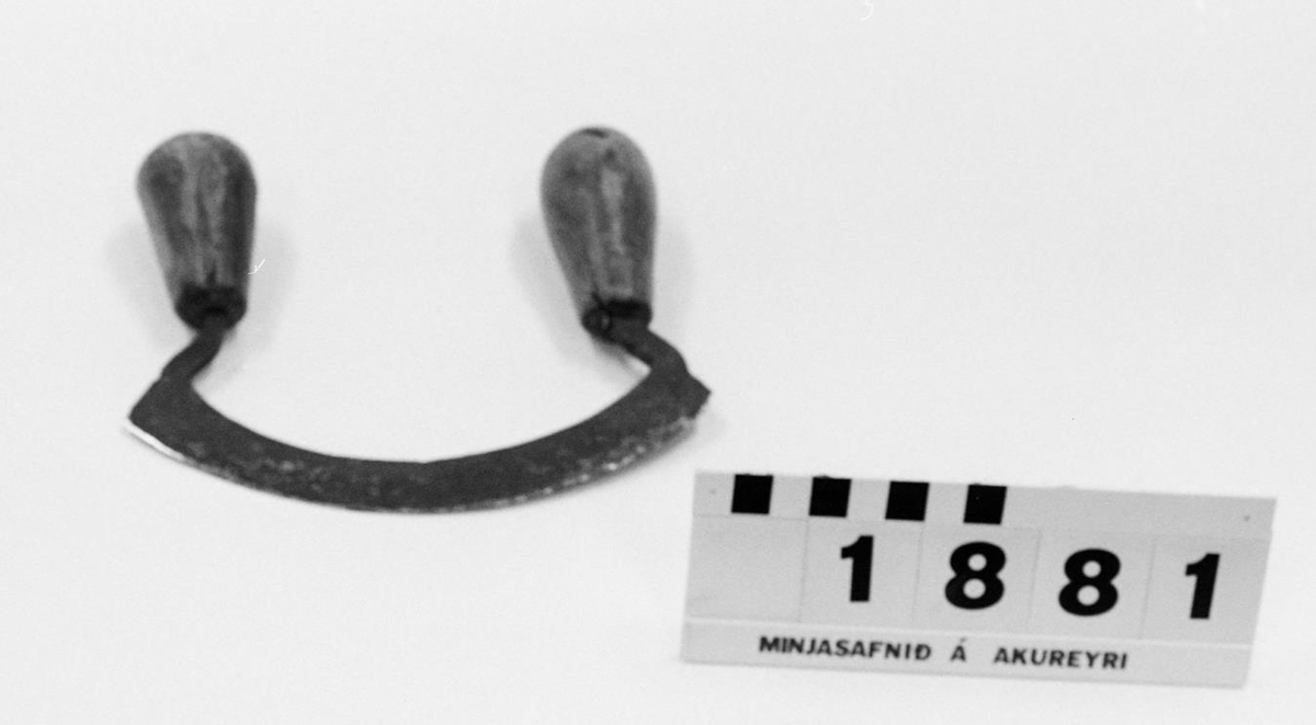 með tálguðum trésköftum. Blað nokkuð ryðgað.