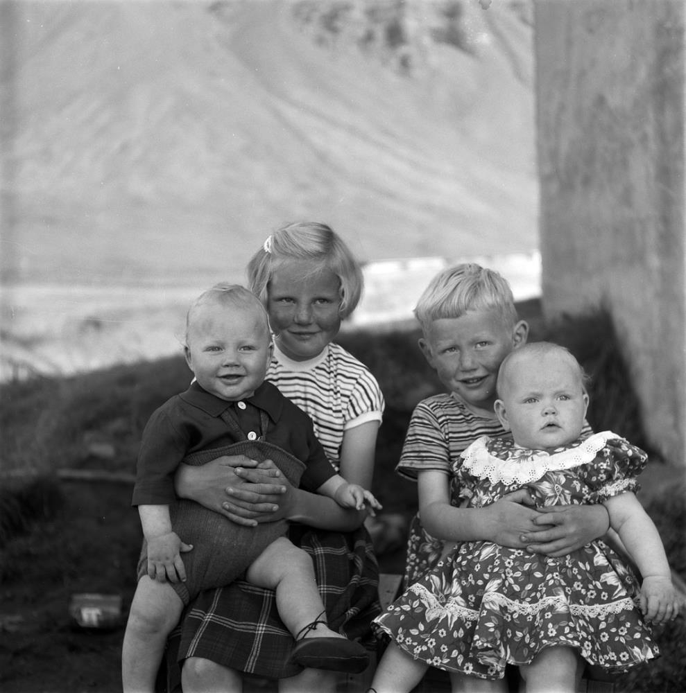 „Systkynin Torfhildur Hólm og Steinþór með tvíburnara Fjölni og Steinunni Torfabörn á Hala.“ (ST 2021)