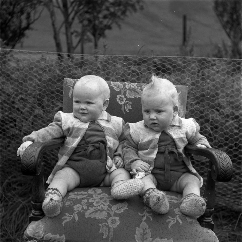 A-Skaftafellssýsla. Suðursveit. Litlir tvíburar sitja úti í stól.