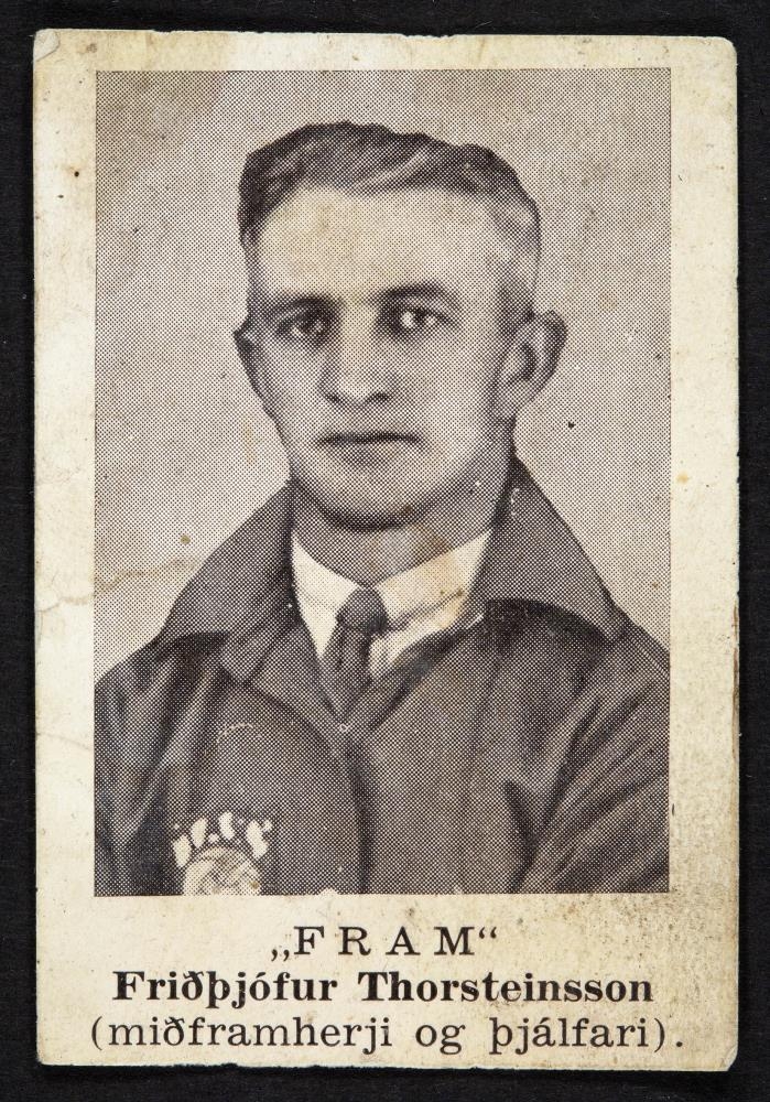 Friðþjófur Thorsteinsson leikmaður Fram. Einn fremsti knattspyrnumaður Íslands á fyrstu árum íslenskrar knattspyrnu. Spilaði í vígsluleik Melavallarins 1911. Var í Edinborg við nám 1914-1918 og spilaði þá með áhugmannaliði Hibernian F.C. Var síðar knattspyrnuþjálfari, bæði í Kanada og á Íslandi þar sem hann stýrði Fram á þeim tíma sem þessi mynd er tekin. Undir myndinni stendur: „FRAM“ Friðþjófur Thorsteinsson (miðframherji og þjálfari).