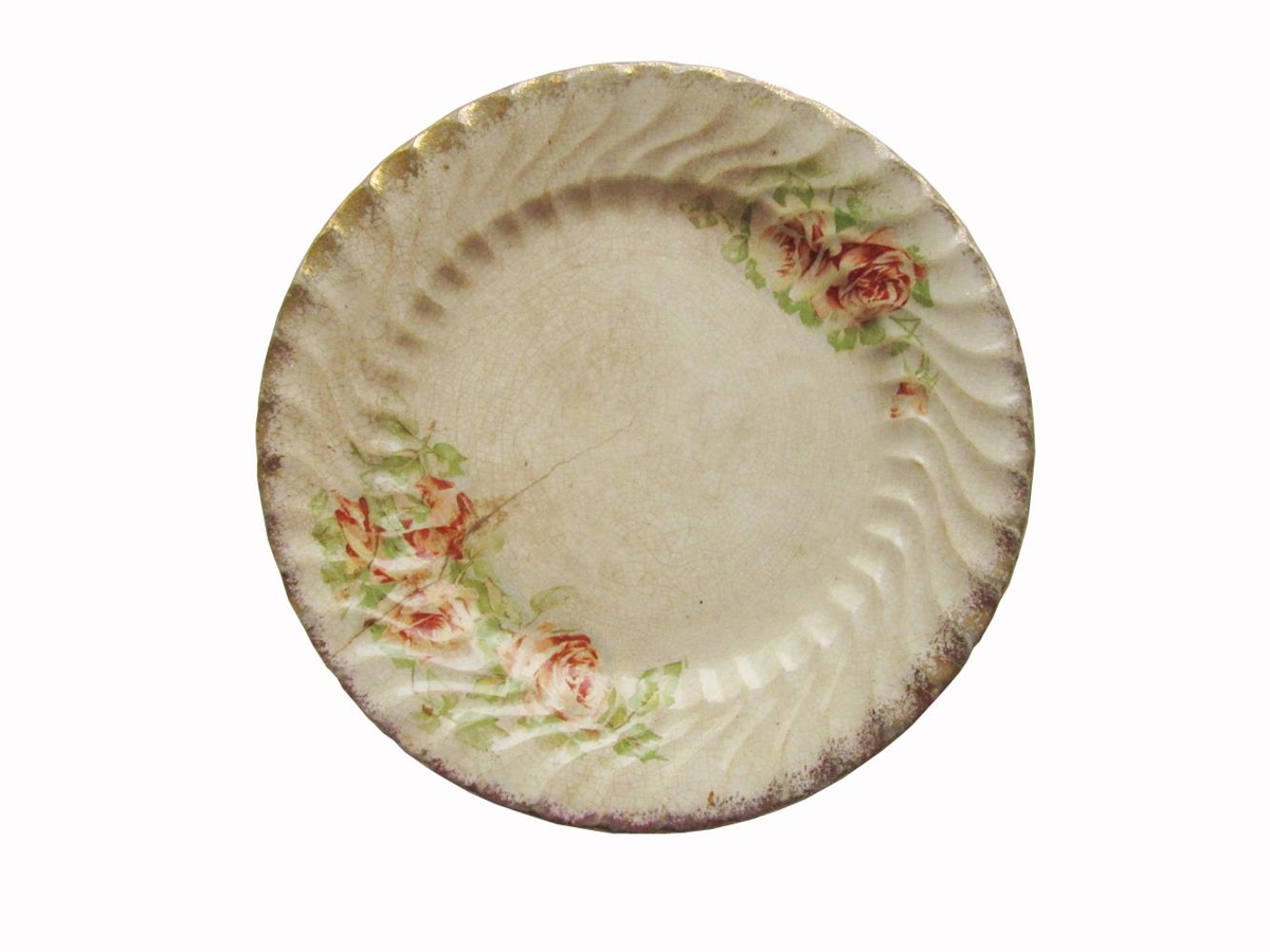 Diskurinn er með rósaskreytingum. Rósirnar eru rauðar og bleikar með grænum blöðum. Glerungurinn á disknum er mikið sprunginn. Gylling er á köntum. Stór og áberandi sprunga er á disknum. Hún gengur í gegnum stærra blómamynstrið alveg inní miðjan diskinn. Hún er 9 cm löng. Páll Heimir Hanneson gaf gripinn. Hann var í eigu ömmu og afa gefanda, Páls Hannessonar bónda og Guðrúnar Björnsdóttur frá Guðlaugsstöðum í Austur-Húnavatnssýslu.
