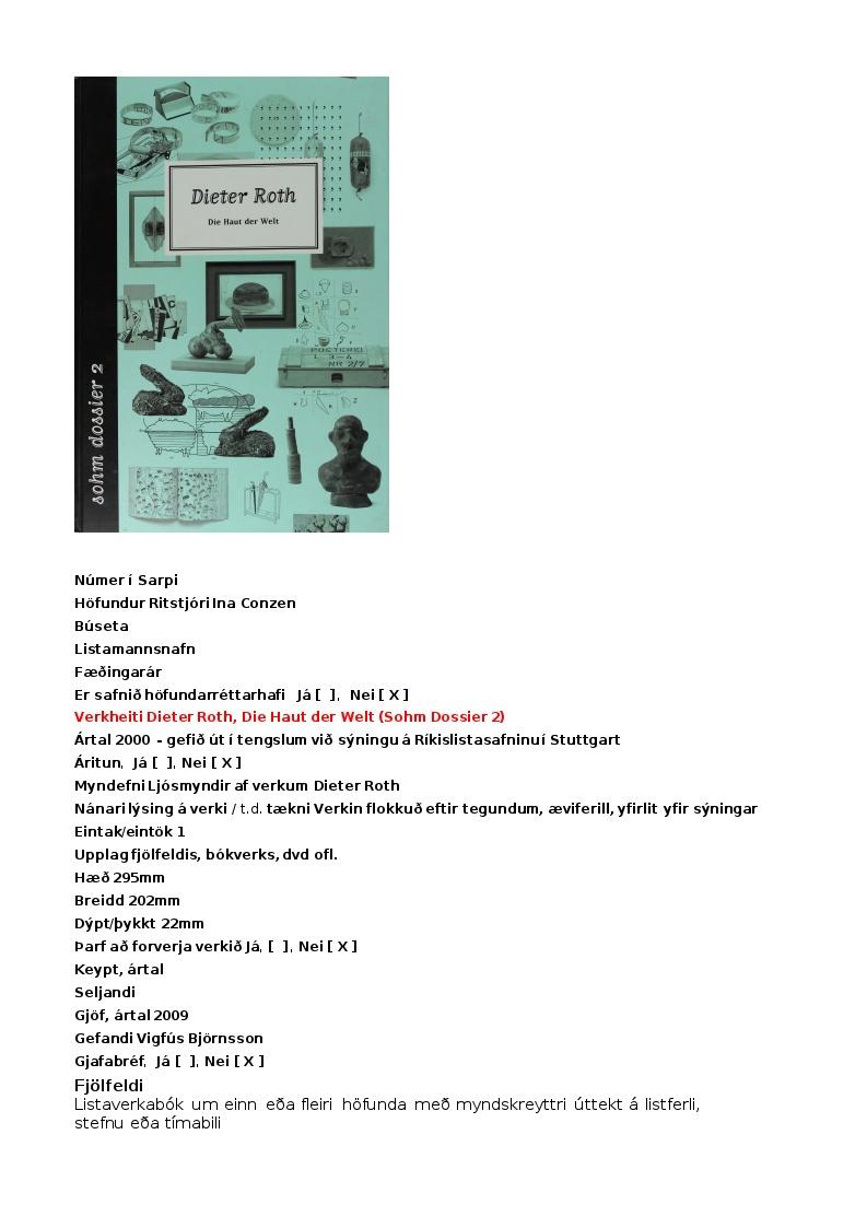 Go Back To SearchDo you know more?Save to My CollectionPrintCopy linkOrder a photoTerms of UseDieter Roth, Die Haut der Welt (Sohm Dossier 2)= 2000, Dieter RothIn preservation atIcelandic Folk and Outsider Art MuseumMain informationTitleArt title: Dieter Roth, Die Haut der Welt (Sohm Dossier 2)Dating= 2000Object-related numbersMuseumnumber a: S-1334Dimensions29.5 x 20.2 x 2.2 cmRecord typeArtCollectionUndirskrá: Almenn listmunaskráClassificationBóklist, Bókverk